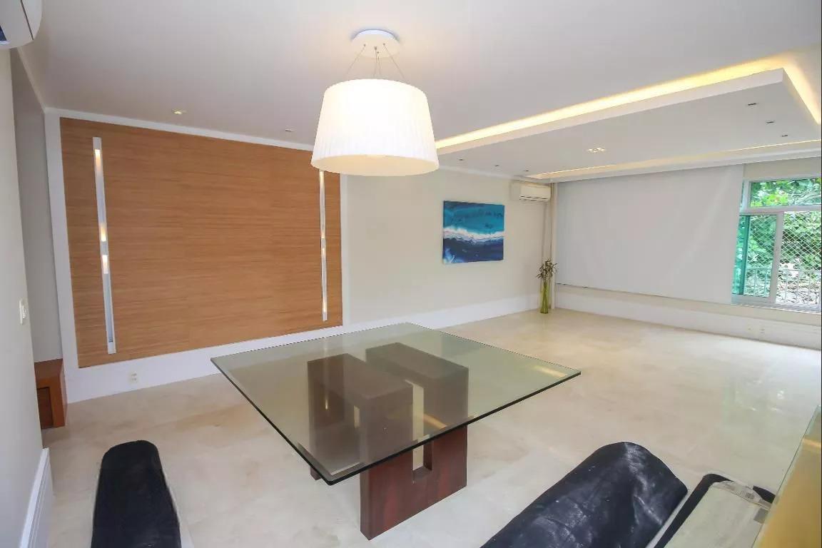 LEBLON QUADRÍSSIMA PRAIA!! Aristides Espínola. Excelente Triplex com 330m2, totalmente reformada, originalmente 4 quartos, transformada em 3 quartos, sendo 2 suítes, toda equipada com ar condicionado em todos os cômodos (inclusive cozinha), marcenaria planejada e portas blindadas (principal e acesso ao terraço). 1 Andar: Amplo salão em L com grandes janelas com vista pras copas das árvores, 3 quartos, sendo 2 suítes com closets, banheiro social, lavabo, cozinha grande, dependência completa de empregada e área de serviço (planta circular); 2 Andar (acesso por escada linear): Amplo salão, com janelas grandes, sala de TV, escritório e lavabo; Terraço (acesso por escada linear): Terraço com churrasqueira, sauna, piscina, chuveiro, lavabo e vista para o mar. Prédio aconchegante, bem administrado, com acessibilidade, portaria 24hrs e com 1 vaga na escritura + uma na convenção