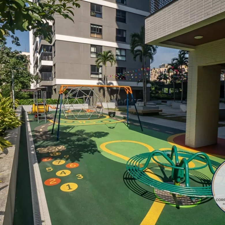 Playground, Piscina, Churrasqueira, Quadra esportiva, Academia, Salão de festas, Sauna, Brinquedoteca, Corrimão, Piso tátil, Rampas de acesso, Salão de jogos, Vaga de garagem acessível, Área verde, Elevador, Portaria 24h
